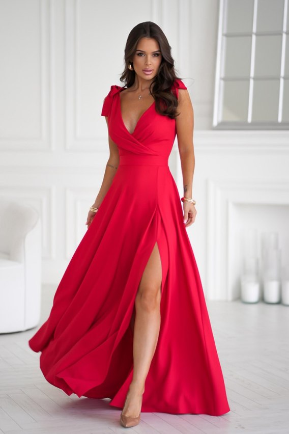 231-02 Długa Sukienka Z Kokardami - czerwony