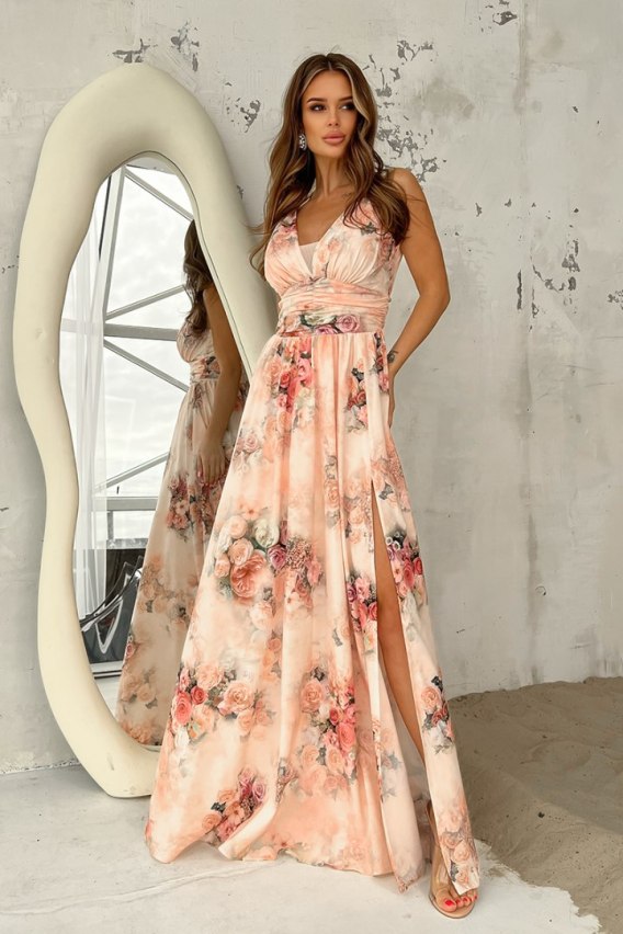 245-17 Długa Sukienka W Kwiaty - brzoskwiniowy