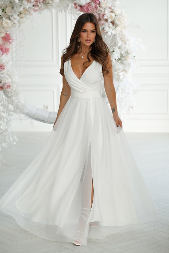 248-04 Długa Sukienka Z Rozcięciem Na Nodze - Ecru