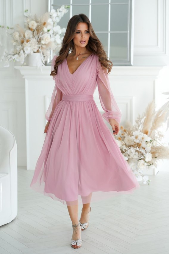 269-20 Sukienka Midi Z Brokatową Siatką - brudny róż