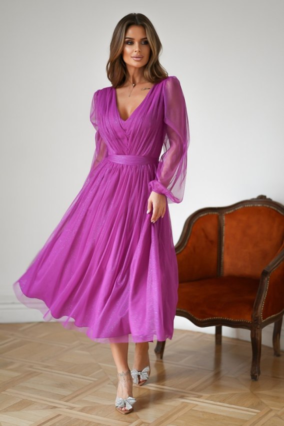 269-51-01 Sukienka Midi Z Brokatową Siatką - fioletowy