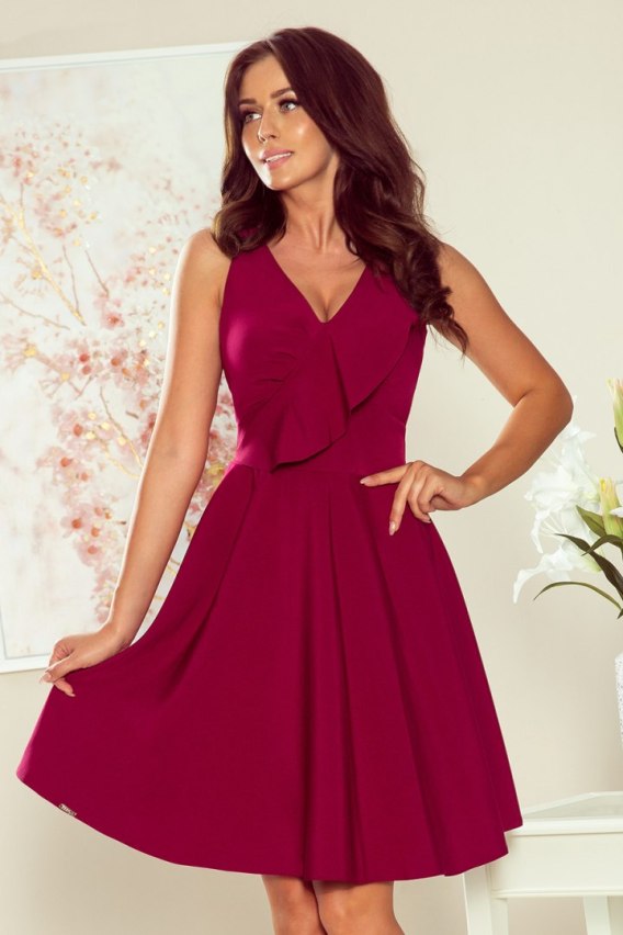 ANITA bordowa rozkloszowana sukienka z falbanką na dekolcie. Marka numoco. Produkcja polska.