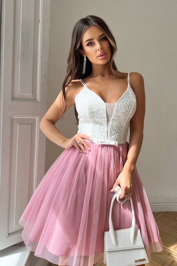 285-36 Krótka Tiulowa Sukienka Na Ramiączkach - różowy
