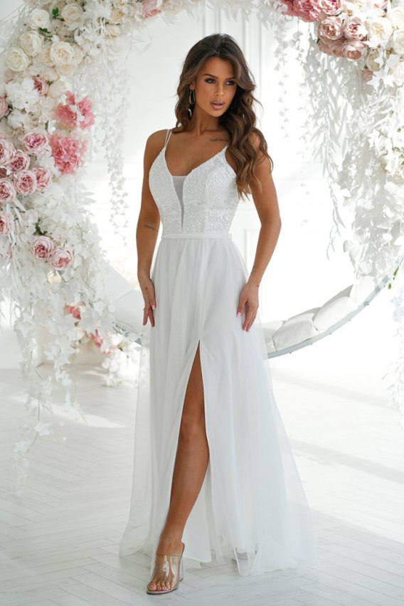 300-04 Długa Tiulowa Sukienka Na Ramiączkach - Ecru